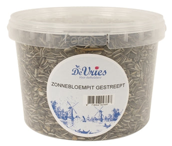 De Vries Zonnebloempit Gestreept 3 liter is aanvullend diervoeder voor vogels, geheel natuurlijke zonnebloempitten voor jouw vogel, de ideale aanvulling of snack voor grotere parkieten en (dwerg)papegaaien. Deze lekkere snack is zeer geliefd bij veel vogels en is ideaal om als beloning bij training of als aanvulling op het voer te geven. In een handige hersluitbare emmer!