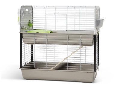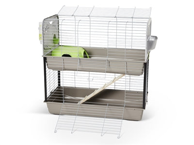 Een dubbele knaagdierkooi met modern design. De toplaag bevat twee plastic zijpanelen met geïntegreerde voerbak, drinkfles en hooi / groenten rekje. Een houten trapje zorgt voor de verbinding tussen het boven- en onderdek. De kooi bevat daarnaast een verstophuisje / platform in één. In de onderste kooi bevindt zich een grote deur om het onderste gedeelte gemakkelijk te bereiken. De bovenste kooi heeft een kleine deur aan de voorkant en een grotere deur aan de bovenkant om gemakkelijk in de kooi te komen. De Caesar is inklapbaar, wat het vervoeren van de kooi gemakkelijk maakt.