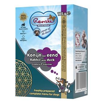 De Renske Vers Bereide Maaltijd Met Konijn En Eend Graanvrij natvoer van 24 x 185 gr is een volledige, smakelijke vers bereide vleesmaaltijd voor honden vanaf 9 weken, met 60% vers bereid vlees, rijst en groenten. Jouw hond geniet van dit natuurlijke, vers bereide natvoer van Renske! Deze vers bereide vleesmaaltijd bestaat voor maar liefst uit 60% uit kalkoen en eend, zónder vis en kip! Ook ideaal voor honden die gevoelig zijn voor bepaalde eiwitten dus. Het voer is aangevuld met rijst en heerlijke groenten van hoge kwaliteit, en nuttige toevoegingen zoals duindoorn, algen, yucca en xylo-oligosacchariden, een natuurlijke bron van prebiotica. Deze combinatie zorgt voor een fikse dosis antioxidanten, ondersteuning van het immuunsysteem en een gezonde spijsvetering. Door de hoogwaardige ingrediënten is de maaltijd licht verteerbaar en ook geschikt voor moeilijke eters. Hypoallergeen, glutenvrij en verpakt in kleinere porties. Perfect dus ook als alternatief voor rauwe voeding én onderweg!