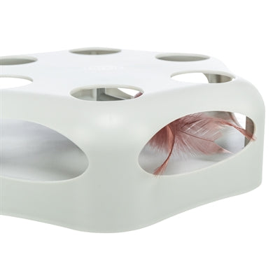 De Trixie Turning Feather is een interactief speeltje voor nieuwsgierige katten. De veer in het midden beweegt onvoorspelbaar heen en weer, stopt af en toe en verandert willekeurig van richting – perfect om het jachtinstinct van je kat te prikkelen. Het speeltje kan worden gevuld met kleine beloningssnoepjes voor extra motivatie. Dankzij de rubberen voetjes blijft het stevig staan tijdens het spelen. Na ongeveer 15 minuten schakelt het automatisch uit. Werkt op 3 AA-batterijen (niet inbegrepen).