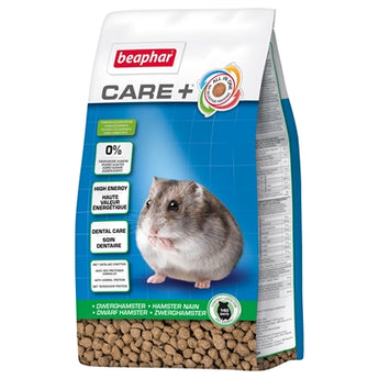 Care+ Dwerghamster is een geëxtrudeerde super premium en volledige voeding voor dwerghamsters. Ieder brokje heeft dezelfde samenstelling (All-in-One), met als resultaat: geen selectief eetgedrag. De harde brokjes ondersteunen de tandslijtage (Dental Function). Met een uitgebalanceerde verhouding van de meervoudig onverzadigde vetzuren Omega 3 & Omega 6 (uit maïs, tarwe, soja en vlaszaad) en dierlijke eiwitten, wat zorgt voor een gezonde vacht, en een hogere weerstand tegen ziekten. Met Yucca Schidigera voor vermindering van de ontlastingsgeur en is Spirulina toegevoegd als bron voor verschillende belangrijke vitaminen en mineralen. Care+ is optimaal afgestemd op de natuurlijke voedingsbehoefte van dwerghamsters. Zo heeft dit voer een hoger vetgehalte dan normaal hamstervoer vanwege het hogere energiegebruik.