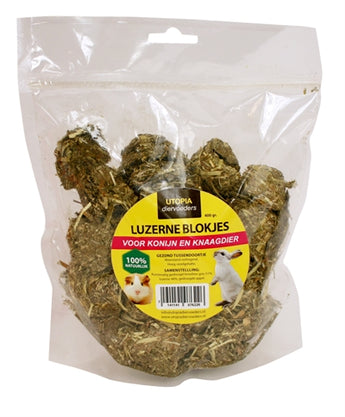 De Utopia Luzerne Blokjes van 400 gram zijn gezonde, aanvullende knaagsnacks voor konijnen en knaagdieren, een 100% natuurlijk tussendoortje rijk aan vezels. Jouw konijn of knaagdier verwennen kan met deze luzerneblokjes van Utopia! Deze blokjes bestaan uit een onweerstaanbare combinatie van gedroogd timothee gras, luzerne en gedroogde appel. NIet alleen ontzettend lekker, maar ook nog eens geheel natuurlijk én gezond! Deze blokjes bevatten namelijk een hoog vezelgehalte, waardoor ze bijdragen aan een goede spijsvertering en gebitsverzorging. Bovendien ondersteunen de ingrediënten een goede weerstand. Heerlijk om op te knabbelen, zo hoeft jouw dier zich gelijk niet te vervelen!